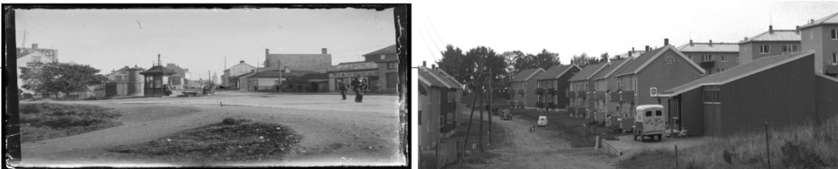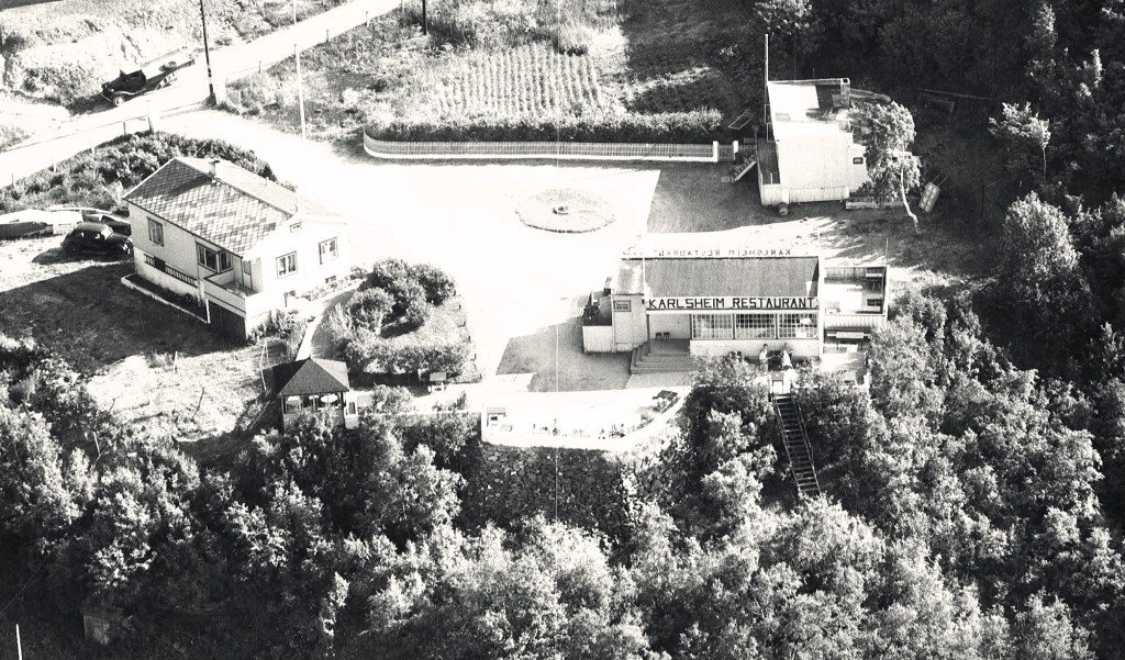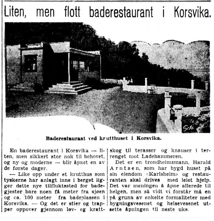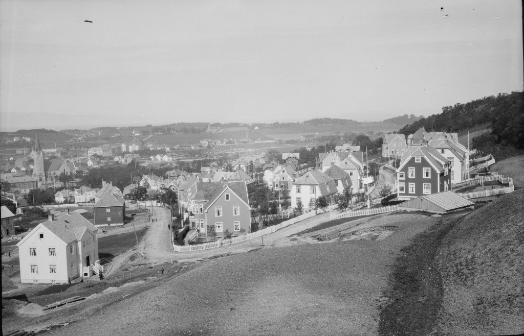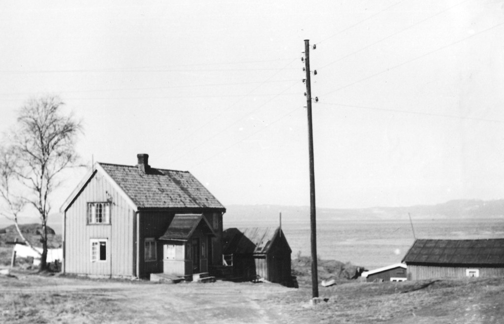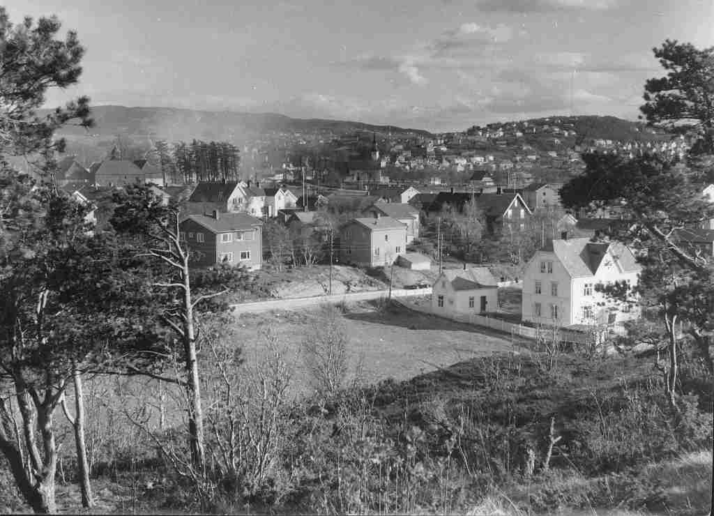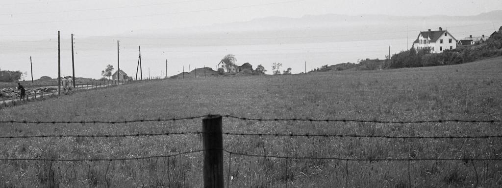 Gunnerus: Området opp for Korsvika. Foto: Hifling-Rasmussen, juni 1939. I henhold lokalkjente Per Isaksen ser vi til venstre Hauganplass, Korsvikberget i midten og Villa Sandberg til høyre. Piggtråden skal være for å holde krøtter fra Lade gård inne/ute.