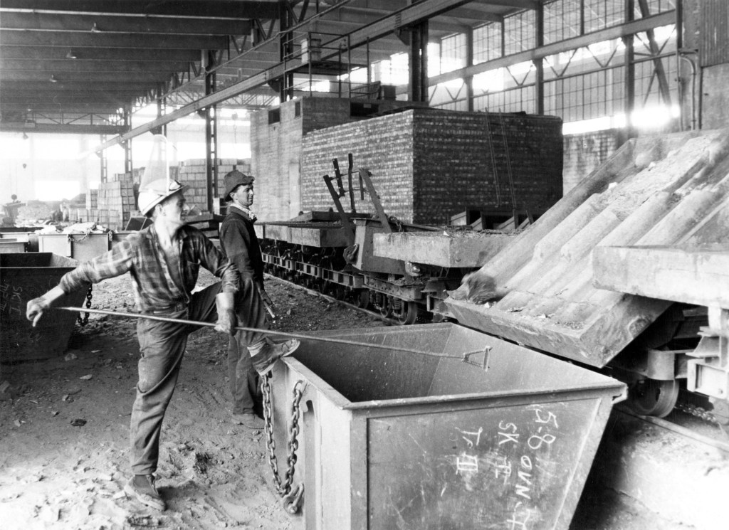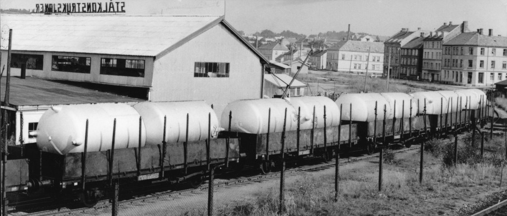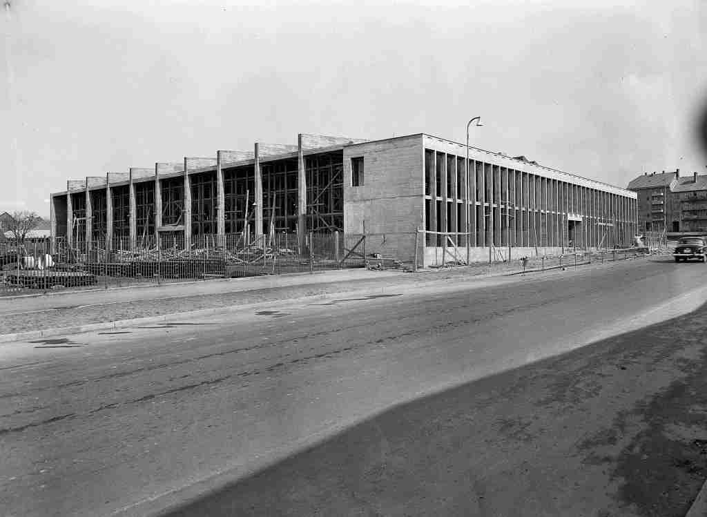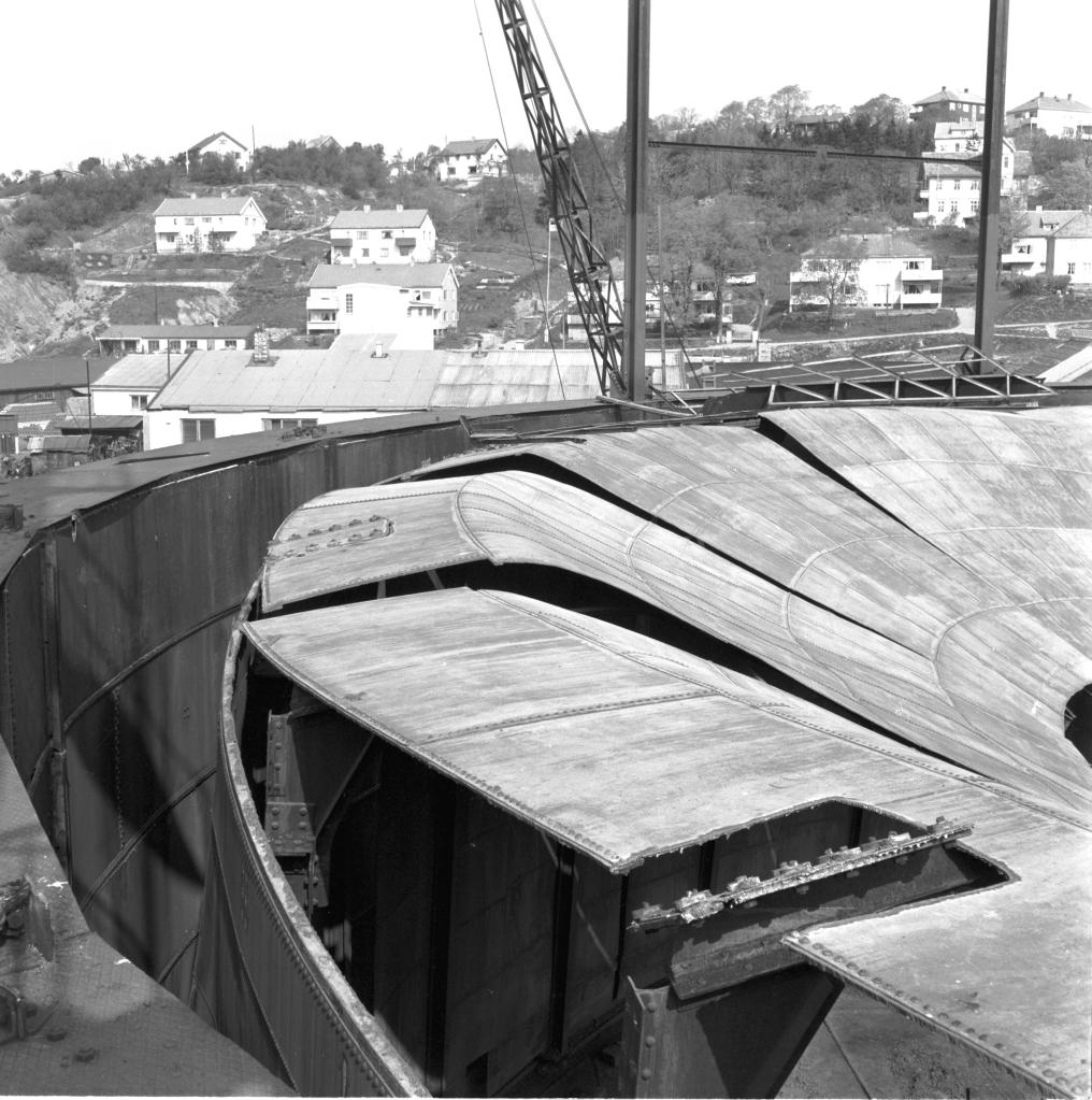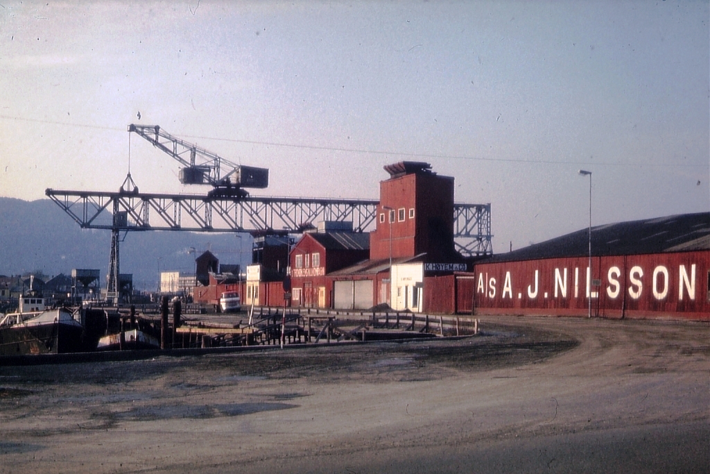 Gassverket på Jarlheimsletta ble oppført 1914-20. Gassverket ble totalskadd i 1943 under et bombeangrep på tyskernes anlegg på Nyhavna. Gassverket ble gjenoppbygd, og kom i vanlig drift i 1946. Gassverket ble vedtatt nedlagt i 1954, men siste leveranse av gass skjedde i 1957. Foto: Klaus Forbregd; giver: Grete Forbregd. Bildet er tatt i mai 1959.