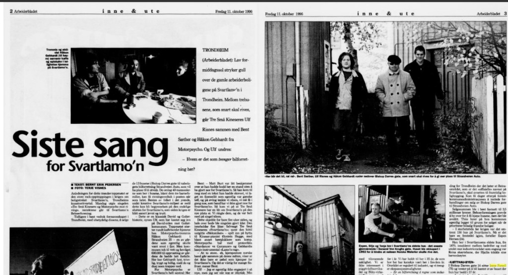 Når man ser på Arbeiderbladet fra fredag 11. oktober 1996 med tittel «Siste sang for Svartlamon» sitter man igjen med et klart inntrykk av en bydel i motbakke, men med kampvilje. Strandveien Auto er fortsatt her, og står steilt mot Svartlamon og advokat Venil Katharina Thiis. 75 år gamle Irene Forsell bor fortsatt i huset fra 1875 (Biskop Darres gate 16), hvor hun har bodd i 27 år. Hun har ingen flytteplaner. 24 år unge aktivist Espen Hernes bor i det siste gjenstående huset i General von Kroghs gate fra 1870. Man kan lese om at singelen «Tre Små Kinesere og Motorpsycho mot riving» snart er klar for utgivelse, og at Strandveien Auto ønsker kjøpe og rive de 13 husene i Biskop Darres gate, hvilket Formannskapet nylig hadde godkjent med «ubetydelig dissens». Og endelig er veggmaleriet til Håkon’ene på plass.