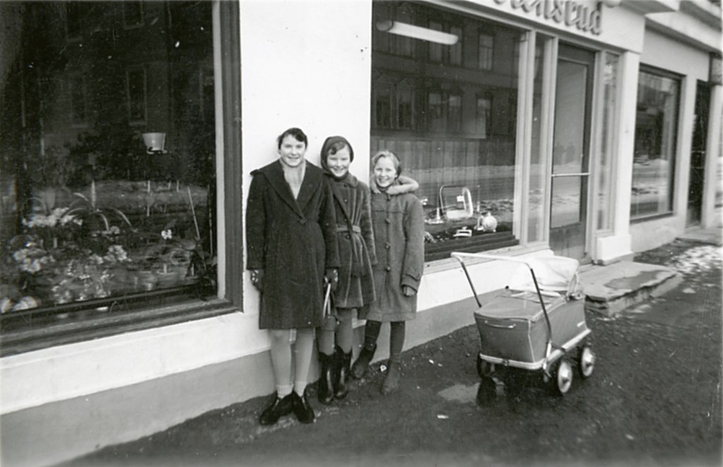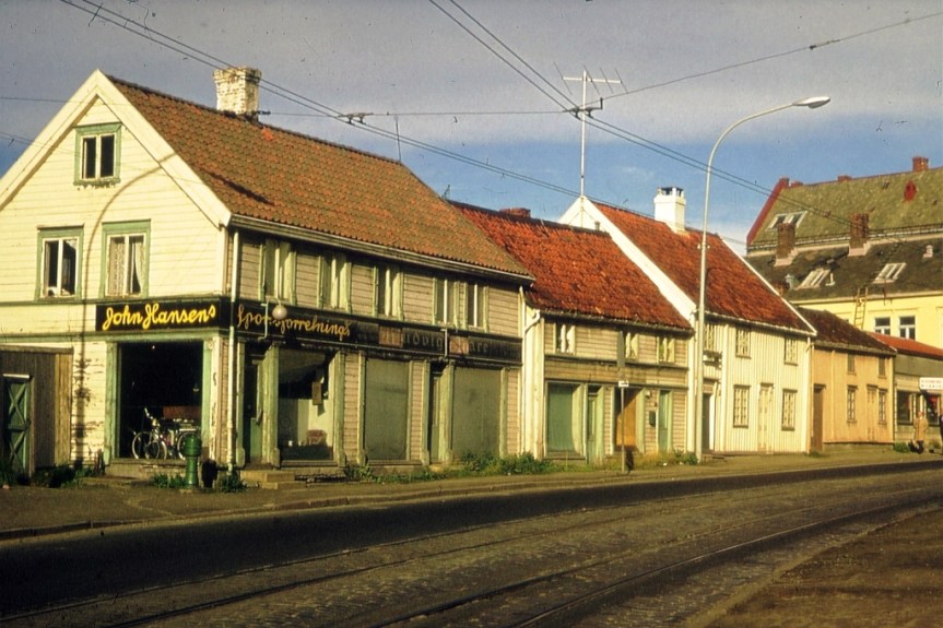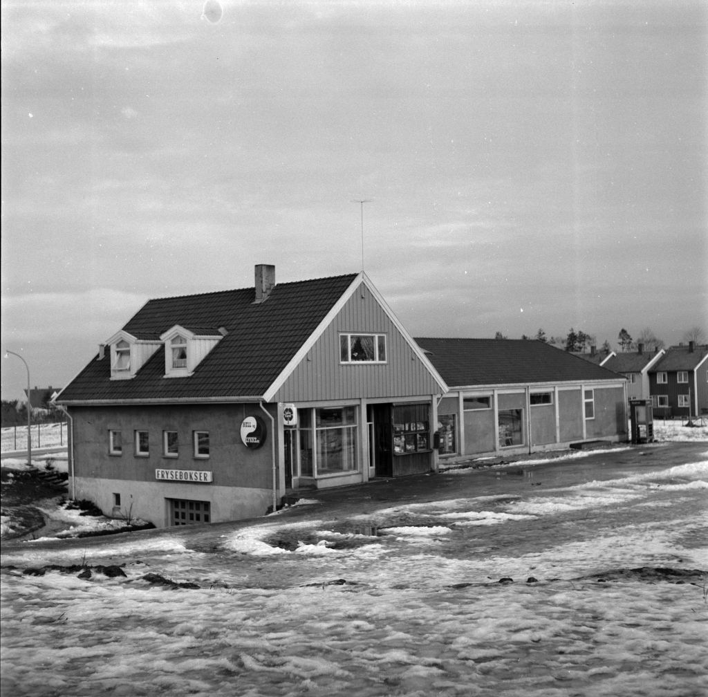 Gunnerus; Hell og Lykke, 1960: «Bildet viser en husfasade, butikk. Skilt. Oppdrags fotografering for Arnold Wiig. Arnold Wiig, fabrikker A/S, keramikk og belysningsprodukter. Dette er Hell og Lykke A/S, kolonial og kjøttforretning i Smestuveien 9 på Fagerheim. I kjelleren er det anlegg for frysebokser. Dette var byens første supermarked.» Før hjemmefrysernes tid kunne Hell og Lykke tilby frysebokser. Foto: Klaus Forbregd, Gunnerus.