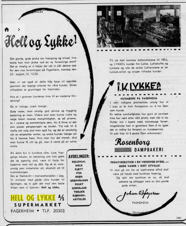 Det er nok endel som gjennom årene har vært innom Hell og lykke på Fagerheim etter åpningen 22. august 1955. Bak stod I.K. Lykke, Rosenborg dampbakeri og Johan O. Helgesen, og i annonsen for åpningen henvendte man seg til «husmødre på Fagerheim». Fra Adresseavisen, august 1955 (Nasjonalbiblioteket).