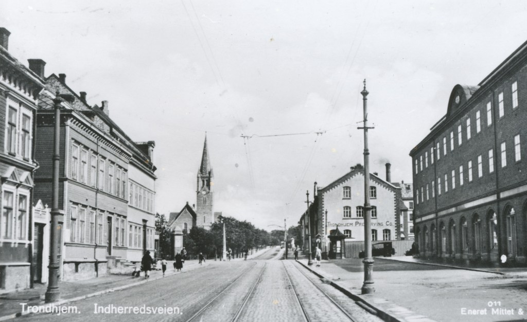 Under: Byarkivet: Innherredsveien med Lademoen kirke og Trondhjem Preserving, Innherredsveien 61. Bedriften flyttet til Østmarkveien 4 i 1987. Kiosker, Buran. Fotograf: Mittet & co. NB! Tidsangivelse for bildet er satt som «ukjent», men basert på at Melkeforsyningen og trikkeskinnene er på plass samt årgangen til drosjene til høyre kan man anslå bildet til ca. 1924-1925.