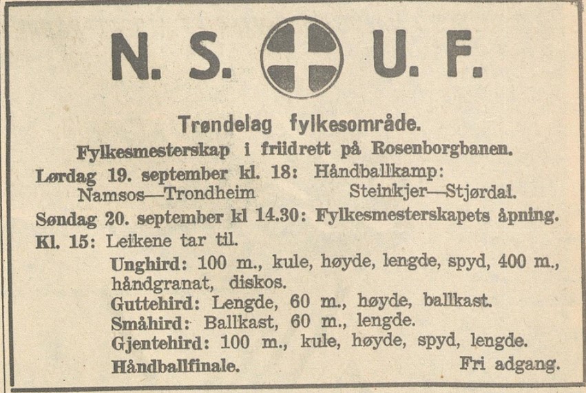 Nazistene la ned stor innsats for å barn og unge med i nazi-bevegelsen. Under er en annonse i Dagsavisen fra 19. september 1942 for Nasjonal Samlings Ungdomsfylking i forbindelse med «Fylkesmesterskapet i friidrett», hvor klasseindelingen inkluderte «småhird» og «gjentehird». Blant øvelsene var 100 m, lengde og «håndgranat».