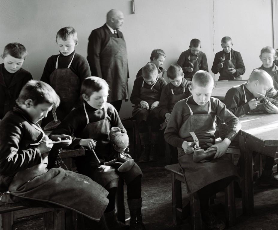 Bildet er et utsnitt av et foto tatt av Jens Carl Fredrik Rifling-Rasmussen, og er fra Lademoen skole ca. 1915. Det er fra en tid da vedlikehold og gjenbruk gjaldt , og lenge før nøysomhet ble erstattet av bruk-og-kast. Guttene på bildet skal ikke nødvendigvis bli skomakere; nye sko var dyre, og vedlikehold var almenkunnskap.