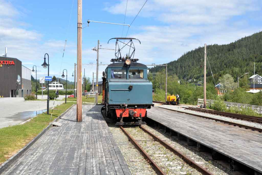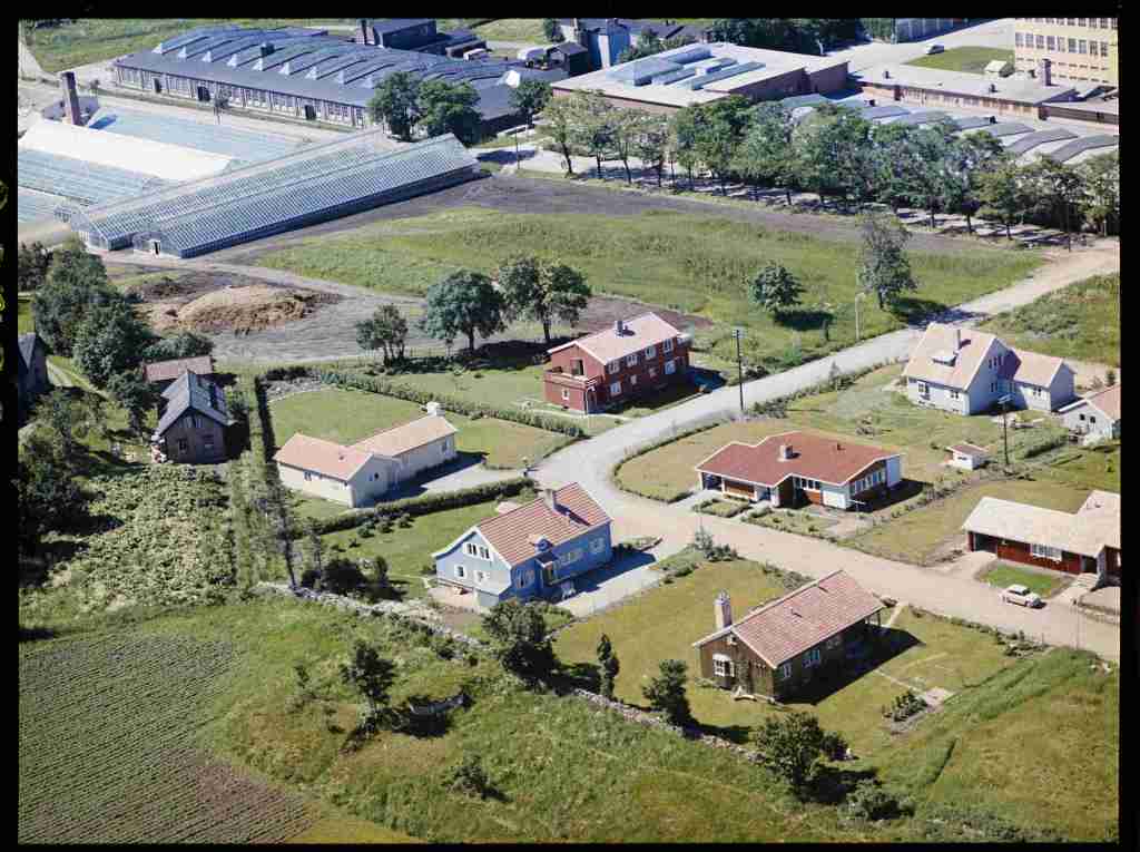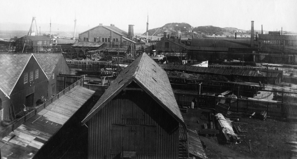 Tekst til bildet under: Stålkonstruksjoner A/S var et sveiseverksted for større konstruksjoner, den lille brakka som er over jernbanevogna er kontoret til Flaten Skiferindustri A/S, som solgte skifer i alle formater. Over taket på den ser vi et lagerskur som skiftet fra alt fra verksted til lager av maling og saltete kuskinn som skulle videreforedles, da luktet det sterkt fra skuret. Til høyre for den brakka – den med det sorte vinduet – var JoBu gressklippere og motorsager, han som drev der het Lønvik. Strandveien ser vi fra høyre mot venstre Voko-hjørnet, der de støpte kirkelys, der er nå en Kafe Ramp. Videre er Ramphålet 25b og Johansen-gården som brann opp Strandveien 27. Så har vi meierigården med melk og brødutsalg, den ble senere Strandveien Auto, dessverre. På andre siden av den åpne plassen var det butikk for garn og klær, den har Almaas. De solgte også ferdigpakkede Saba-bind i gråpapir, så de skulle være diskré. I samme huset var det også kolonialforretning Skaanes. Frukt & Tobakk Hoel kan skimtes så vidt. Den åpne plassen foran Lønvik var det en sementplatting som ble brukt til bygging av Dora, den var inndelt i firkanter som egnet seg til kanonball. Jeg kan huske at vi fant sveise-elektroder ved Stålkonstruksjoner, de trodde vi var stjerneskudd, men de brant veldig dårlig!