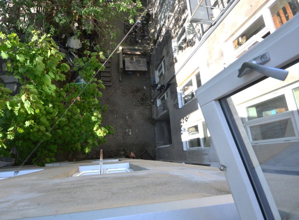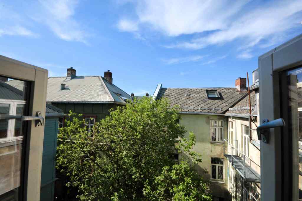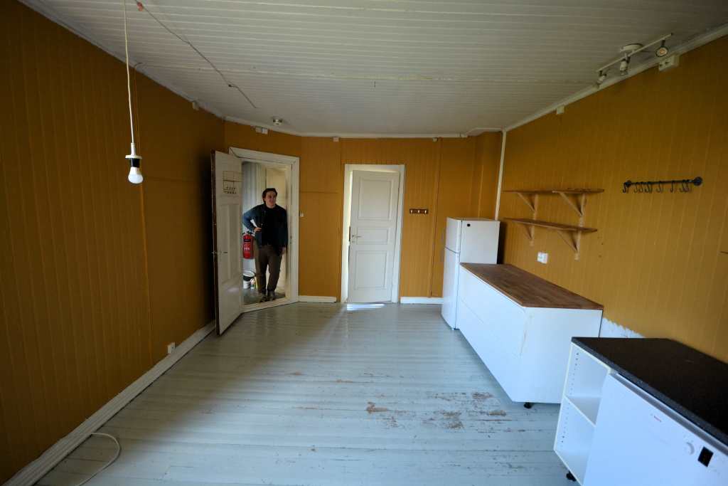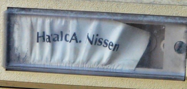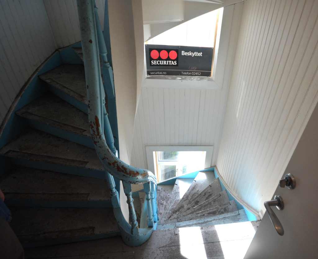 Over: Inngangen til 25b fra Strandveien. Foto: Bjørn Lien.Over: Utsikt fra 4. etasje i 25b mot Nyhavna. Fortsatt i 2024 ser vi jernbaneskinnene, som i årevis var oksygenet til bedrifter på Nyhavna. Det er ting som tyder på at denne idylliske utsikten neppe er den samme om 10 år. Foto: Bjørn Lien.Over: Harald A. Nissen bodde i 25b. Han var i stor grad fødselshjelper til at Svartlamon kunne etableres. Hans navn er det eneste som står igjen. Foto: Bjørn Lien.Over: Daglig leder i Svartlamon boligstiftelse, Gjermund Bungum Gorset, viser rundt. Foto: Bjørn Lien.Over: Trappen i 25b. Åpenbart beskyttet av Securitas. Foto: Bjørn Lien.Over: Utsikt fra Ramphålet fra fjerde etasje mot vest. Foto: Bjørn Lien.Over: Bakgården i 25b. Foto: Bjørn Lien.Over: Utsikt fra fra 25b mot syd. Foto: Bjørn Lien.
