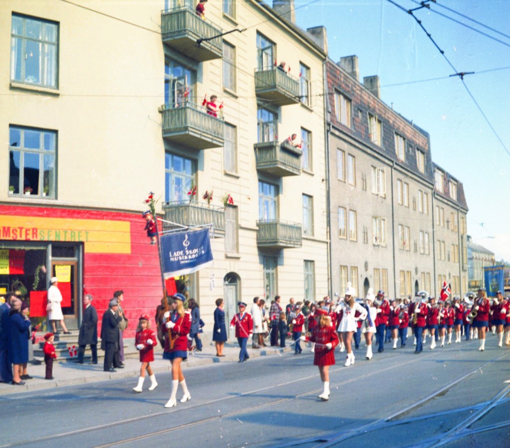 1. mai 1973. Lade skoles musikkorps marsjerer inn i Mellomveien. Foto: Fritz Digre. Byarkivet.