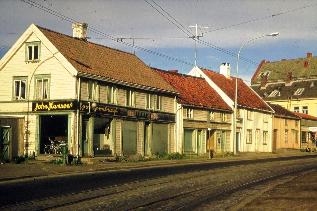 Kommentar: Gunnerus anslår bildet til å være fra 1965-1973. Peder Olsen la ned butikken sin i 1970. Reklamen i vinduet for Fanta Sitron, lansert i 1969, indikerer at bildet en gang mellom 1969 og høsten 1970. Sofie Amalie Nordvik startet allerede forretning i 1917, og hadde adresse i Biskop Darres gate 9 til hun døde i 1972.