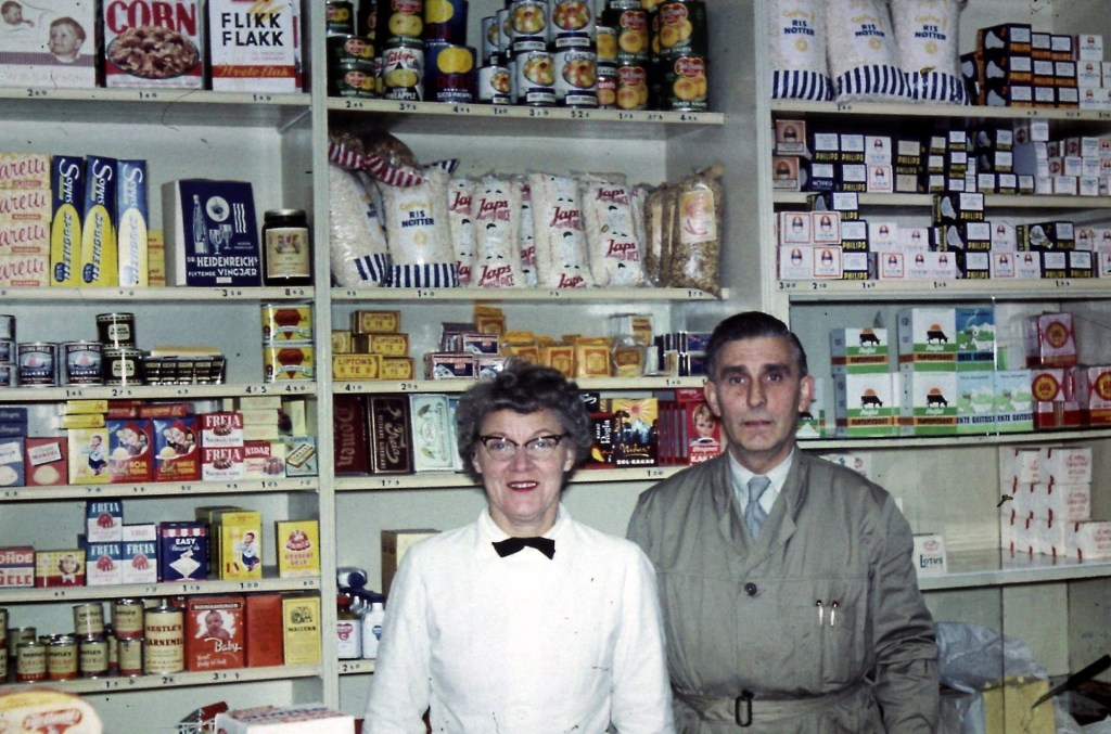 Få eller ingen kolonialvarer var ferdigpakket, jeg måtte tidlig være med mine foreldre å veie opp sukker, mel og erter osv. i poser av forskjellig størrelser. Kaffen skulle males og sirupskannen fylles. Sjåførene fra grossistfirmaene bar tunge 50 kg. melsekker inn på lageret og helte melet ned i store tretønner.
